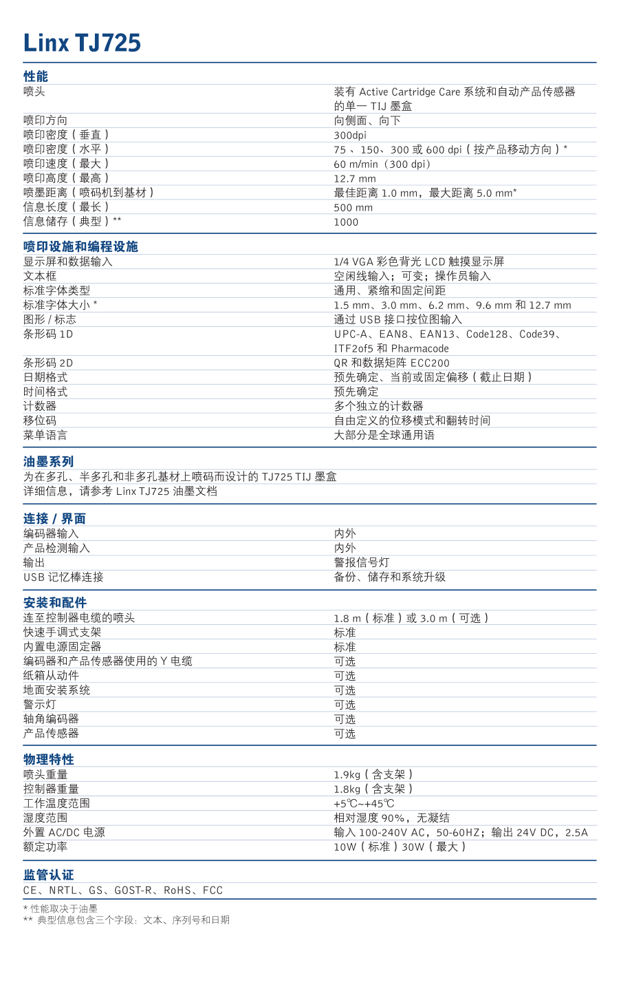 1. Linx TJ725 熱噴墨噴碼機提供可取代滾印機、閥門噴墨和 CIJ 系統的高分辨率數字替代產品。隨 TJ725 提供的各種墨水可實現在箱盒、托盤、套管和塑料包裝材料上的打碼。